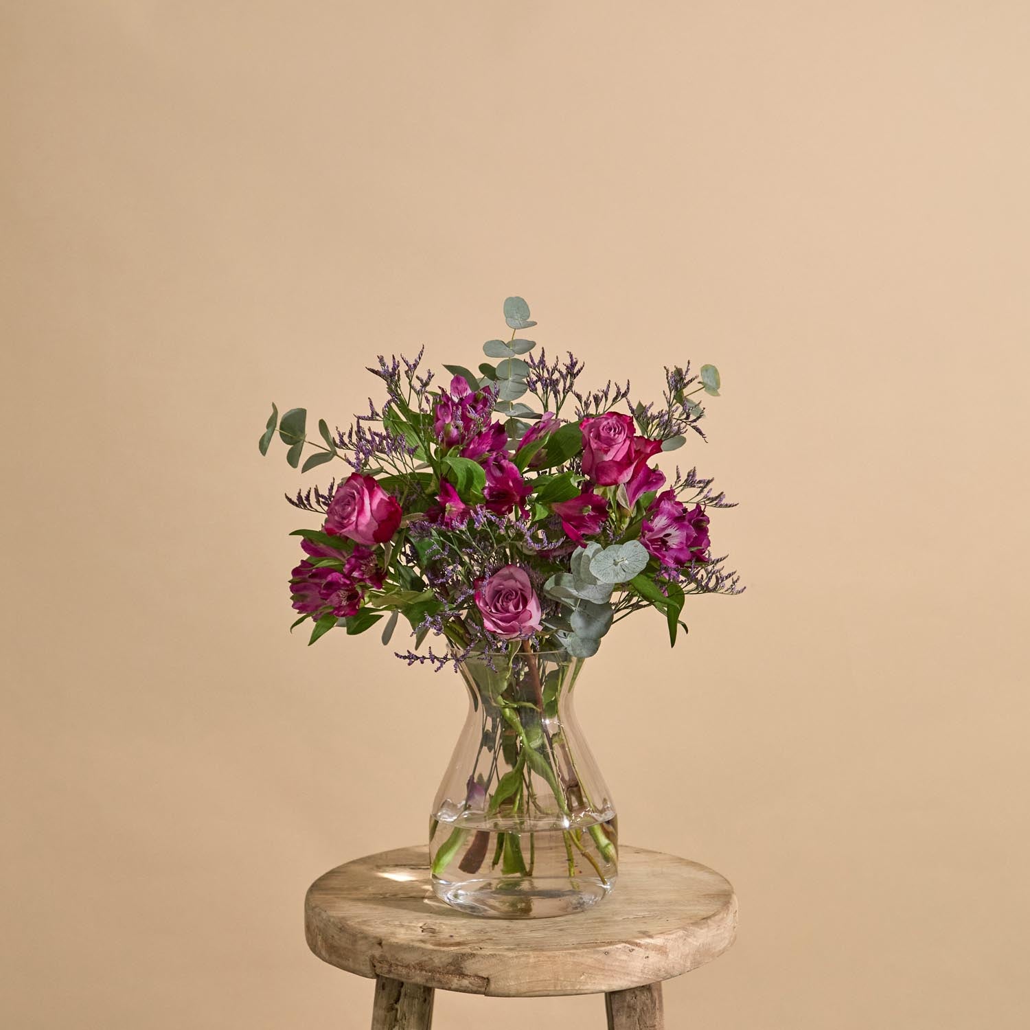 A nod to classical beauty and composition, this arrangement pairs vibrant bursts of red and pink with the most enduring form. Considered and sculptural, it’s a contemporary translation with roses in a playful palette as the central theme, woven through with alstroemeria, Safora Dark limonium, and silvery eucalyptus.